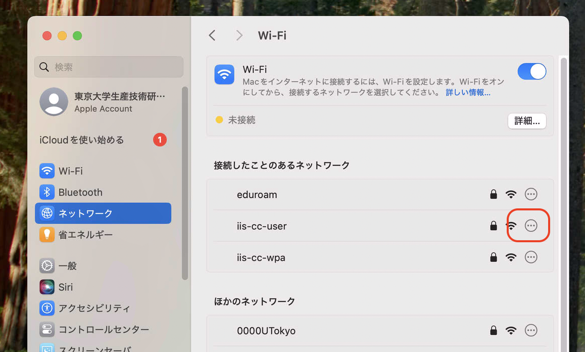 - システム設定の「ネットワーク」を開き、当該 SSID の「(..)」メニューを開きます。