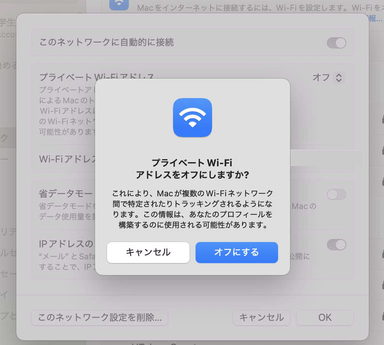Sequioa ではデフォルトでプライベートMACアドレス(MACアドレスのランダム化)が有効になりました。この状態だとMACアドレス認証が必要な無線(=生研のSSID iis-cc-何某)にはつながりません。プライベートMACアドレスをオフにしてください。