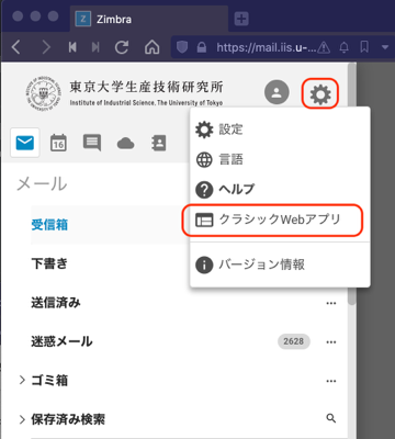 方法2:(ログイン後)画面右上の歯車アイコンから「クラシックWebアプリ」を選ぶ。
